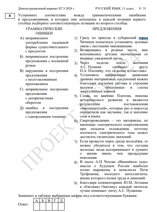 В предложении №9 (благодаря комментариям) - предлог благодаря употребляется с существительным в дательном падеже, то есть правильно. А вот в предложении № 4 ошибка (благодаря изучения -ЧЕГО?, правильно благодаря ЧЕМУ? изучениЮ. Ответ: А-9 Б. Неправильное построение предложения с косвенной речью. Обратите внимание на предложения с кавычками (кроме названий), так как в них может быть личное местоимение, используемое в придаточной части. Предложение №8, №9 - это названия, а вот предложение №3 содержит ошибку. Через неделю после венчания А. С. Пушкин сообщает другу Плетневу, что "Я женат и счастлив". Сочетание подчинительного союза ЧТО (придаточная часть) и личного местоимения Я является примером ошибочного построения предложения. Ответ: Б-3 В. Нарушение в построении предложения с несогласованным прил