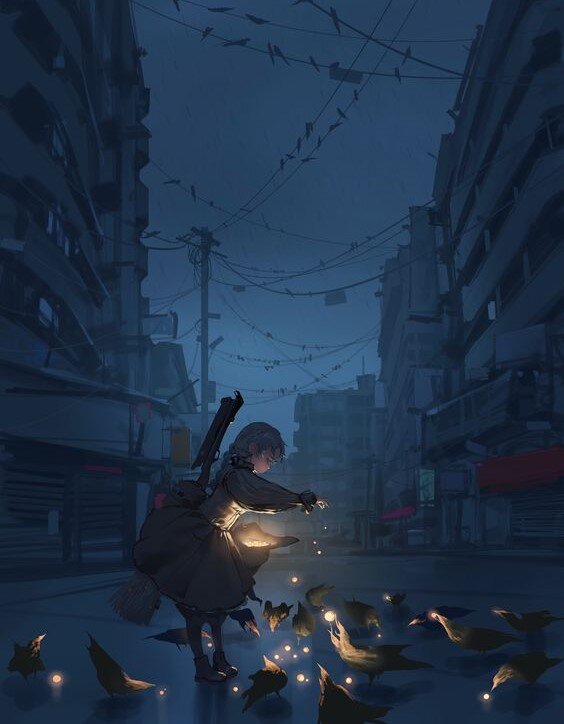 И тут все увидели Ми. Она стояла, у её ног неярко горел её фонарик. Плотным кругом вокруг толпились птицы. Городские голуби. Ми крошила им хлеб. И тихо с ними разговаривала. Как будто они понимали человеческий язык. Голубей было очень много. Они негромко гулюкали. От удовольствия. Давно не приводилось им есть хлебные крошки...