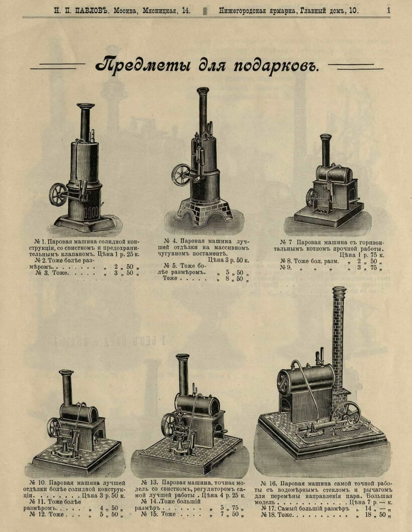 Он издавал отдельный прейскурант с названием «Что подарить самому себе, своим детям и знакомым?». Давайте посмотрим настольные паровые машины, модели паровозов и аэропланов, волшебные фонари (по сути диапроектор), кинопроекторы. И вещи попроще, типа ручного огнива для прикуривания. Зажигалка по нашему…. Благодарю за внимание!