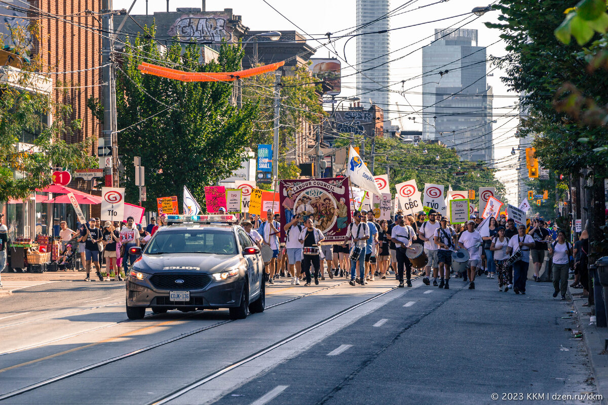 Каждый год, в первый понедельник сентября, улицы Торонто оживают духом Дня Труда. Это выходной день, но зато какой! Улицы наполняются звуками единства, когда работники разных профессий собираются, чтобы напомнить капиталистам о своих правах и отпраздновать солидарность трудового движения. Кстати, если читатели смогут мне объяснить почему у них в странах День солидарности трудящихся отмечается 1 мая, как раз перед летним сезоном, когда большинство берут отпуска и отдыхают. А в Канаде и США это день отмечается перед бизнес-сезоном, с приходом осени - лично мне это кажется более логичным?! 1. Парад Дня Труда в Торонто уходит корнями в 1872 год, когда профсоюзы города организовали первую забастовку в стране, требуя девятичасовой рабочей недели. 2. Телеканалы и интернет-издания, финансируемые правительством Канады сейчас переживают не лучшие времена. Жизнь дорожает и они хотят больше денег, больше зарплат. Иногда вопрос даже не в этом, потому что правительство постепенно сокращает затратны