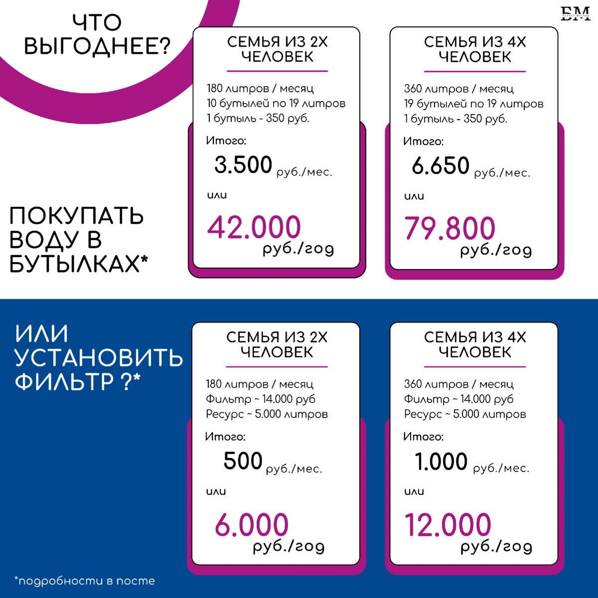 Ранее мы уже обсуждали важную роль качественной воды в нашей жизни и упоминали причины, по которым употребление воды из-под крана крайне нежелательно. Кроме того, мы провели сравнительный анализ бутилированной и фильтрованной воды, и выяснили, что последняя имеет ряд преимуществ. А что насчет экономической выгоды? Давайте считать! 💧 Норма потребления воды По рекомендациям ВОЗ взрослому человеку необходимо ежедневно употреблять от 2х литров чистой питьевой воды для предотвращения обезвоживания. Прибавим воду, используемую при приготовлении пищи и чая/кофе (это минимум плюс 1 литр) - итого, если не брать в расчёт другие расходы (домашние питомцы, полив растений и пр.), человек потребляет в сутки минимум 3 литра воды. В пересчёте на месяц будет ~90 литров на человека (в зимнее время эта цифра может быть меньше, в летнее – больше). Таким образом, семья из двух человек потребляет как минимум 180 литров воды ежемесячно, семья из четырех человек - 360 литров. 🫙Стоимость бутилиров