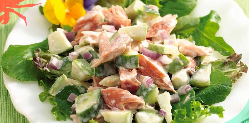 Ингредиенты: Для начала размораживаем семгу: перекладываем с морозильной камеры на полку холодильника на бумажное полотенце. Затем промываем, даем обсохнуть. Берем сковороду, разогреваем масло и обжариваем рыбу по 3 минуты с каждой стороны. Остужаем и разделяем на небольшие кусочки. Лук очищаем шелухи и мелко нарезаем. Яблоко и огурец нарезаем средними ломтиками. Затем готовим заправку: взбиваем сметану, майонез, уксус, горчицу, сахар и перец. После чего добавляем сливки и перемешиваем ещё раз. Заливаем сёмгу, овощи и яблоко соусом. Выкладываем на тарелки сначала листовой салат, а после остальную часть блюда с заправкой. Блюдо готово. Приятного аппетита! Источник: https://wildcrab.ru/news?id=2142