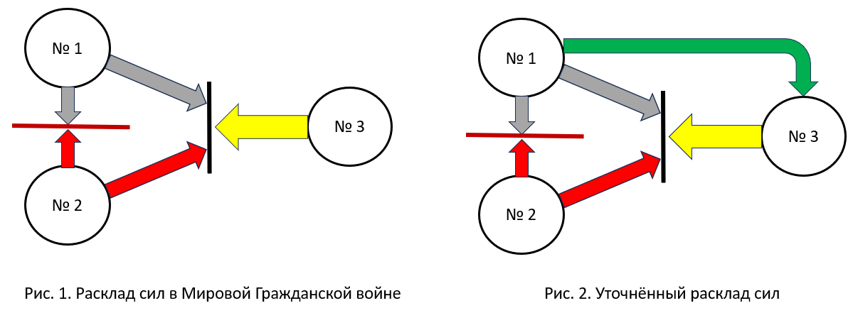 А теперь посмотрим на эту модель “в динамике”, в движении - просто потому, что гражданская война по своему характеру куда динамичнее, чем любая “нормальная” война. И самое динамичное в гражданской войне — это как раз расклад сил. На Рис. 2 представлен уточнённый расклад сил. Новая стрелка отражает переход многих “хатоскрайников” в лагерь “спасителей цивилизации”.