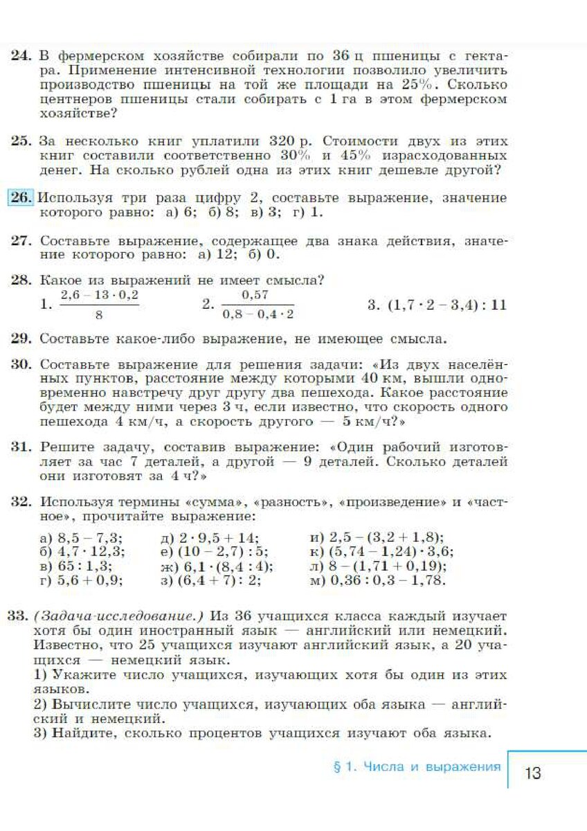 Немного изменю подход к разбору задний. Буду пропускать примеры, т.к. они однотипны и их легко просто проверить калькулятором. 24) В разборе заданий за 6 класс разобрали что такое проценты, и как с ними работать, рекомендую заглянуть, напомнить для себя, чтобы более легко перейти к новым задачам. https://dzen.ru/media/math_and_matics/razbor-zadanii-po-matematike-za-6-klass-2-paragraf-po-vilenkinu-64f69164be84d973e48d766b Здесь задания немного другие, но не сильно сложнее. Наше единое целое - 100% это 36 центнеров пшеницы. Сколько соберем при увеличении производства на 25%? 1% от 36 ц - 0,36 ц., 25% тогда - 0,36*25 = 9 ц. (на 9 центнеров урожай увеличится) Всего же получится 36+9 = 45 ц. Также эту задачу можно записать и одним действием 36*1,25 = 45 ц., либо расписать таким образом: 36 + (0,25*36) = 45 каждый из вариантов правильный. 25) Единое целое, 100% это общая сумма - 320 рублей 1% - 3,20 рублей первая книга - 30% - 3,2*30 = 96 рублей вторая книга - 40% - 3,2*40 = 128 рублей Одна