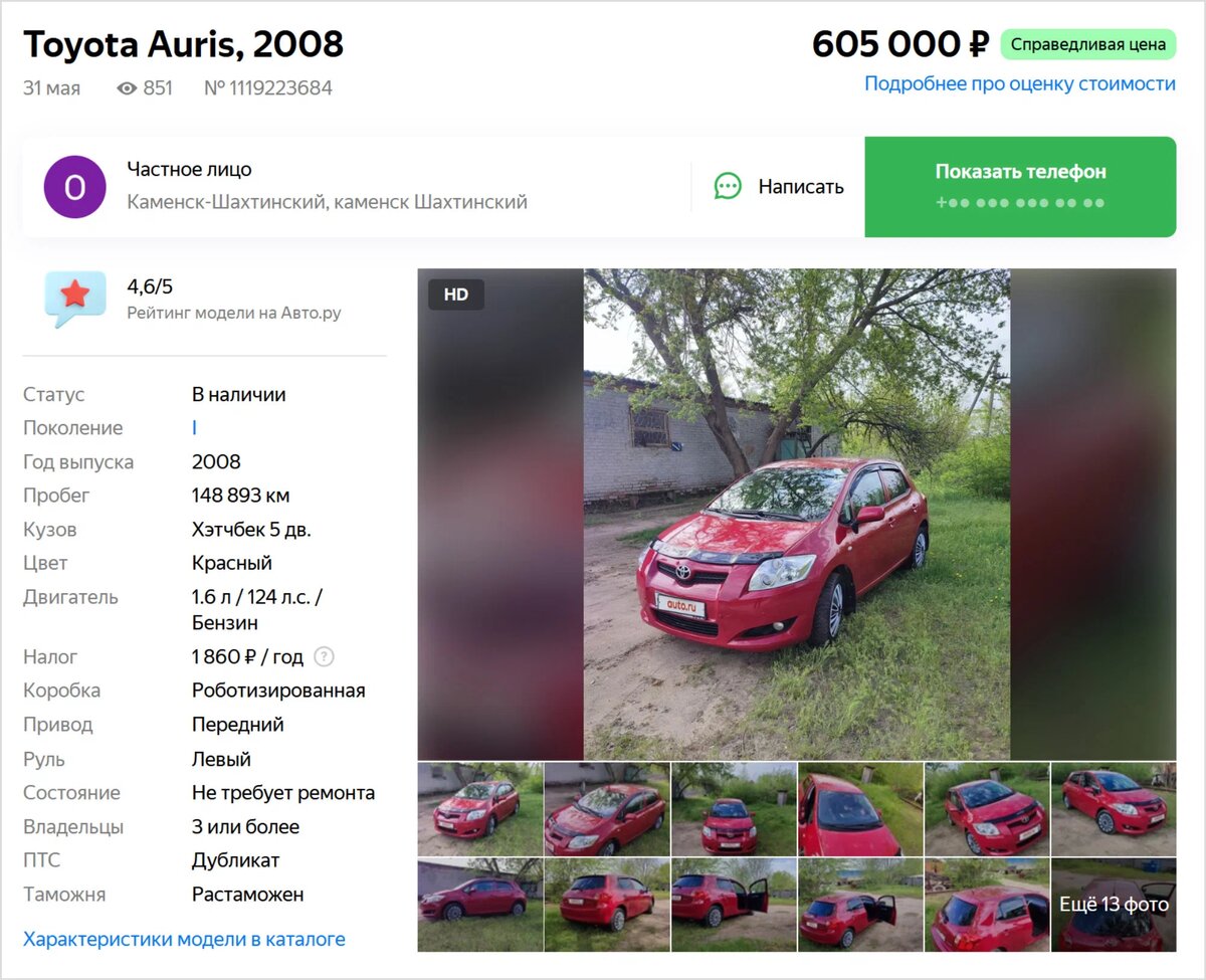 В рубрике «Не бит, не крашен» последнее время мы часто писали про дорогие автомобили с непростой историей — Infiniti Q50, Mercedes-Benz C-класса и Jaguar XF, ради продажи которых владельцы пытаются скрыть правду. Но проблемным может оказаться и банальный хэтчбек не первой свежести, который стоит дешевле любой новой машины в стране. И речь сейчас не только о сколах, царапинах и ободранных о бордюры бамперах, которые для таких машин — вариант нормы. Герой нашего очередного мини-расследования — Toyota Auris первого поколения. Он немолод (автомобиль выпустили в 2008 году), наездил уже почти 150 тысяч километров и, согласно ПТС, принадлежал четырём владельцам. Однако машина совсем не выглядит «уставшей». Просят за хэтчбек 605 тысяч рублей — как подсказывает оценка стоимости Авто.ру, это «справедливая цена». Но продавец готов поторговаться: об этом он сообщил в комментарии к объявлению. Комментарий продавца Автомобиль в отличном техническом состоянии, заменена цепь, и все расходники ГРМ. В к