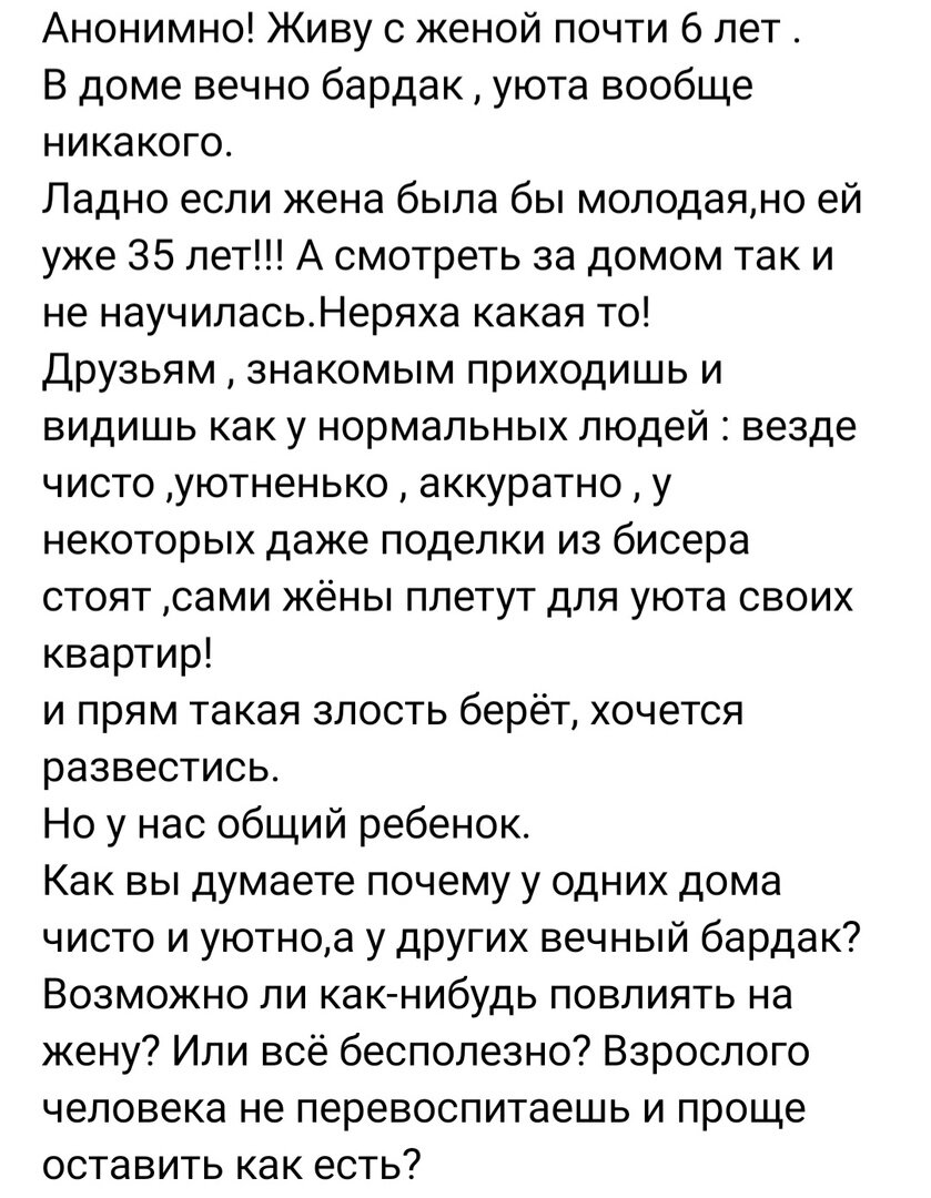 Попался мне тут в местной группе в соцсети вот такой крик души от мужчины: Вот почему у одних хозяек чисто, а у других всегда бардак? Сложный вопрос. А почему у одних мужиков в 35 уже есть своя яхта, дом и прибыльный бизнес, а у других только продавленный диван и грязь под ногтями? Может просто надо относиться к жене не как к обслуге, а как к равноценному члену семьи например? Взять и самому что-то начать делать для уюта, а не ждать пока сделают за тебя? Ситуация конечно странная, как и его претензии. И ни слово о том жена работает или нет, какой возраст у ребенка, ходит ли он в сад, может он постоянно болеет, к примеру. Мне на работе мужики стали делать мозги, что я закрутки не делаю, но у меня нет ни времени, ни желания ими заниматься. Я работаю и на мне дети полностью. И вот когда я мне ещё делать ещё эти дурацкие закрутки ещё, ещё вчера начали да не дай Бог такую жену как ты. Благо, муж у меня понимающий. Надо было у них спросить, сколько этих закруток сделали они сами. Что-то мне