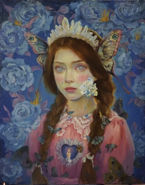 Картина с изображением девушки, выполненная в стиле смешения реалистичных и фантастических элементов, фольклорных портретов, сказочной основы, замысловатого повествования, розового и голубого цветов, пленительных портретов крупным планом.