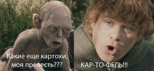 Есть во "Властелине Колец" одна тема, которая при переводе неизбежно теряется напрочь - это название картошки. Даже удивительно, что в русскоязычном фэндоме шутки про Сэма Гэмджи и картошку вполне себе прижились. Что же с этим словом такого? Дело в том, что по тексту Сэм использует не обычное английское слово potato, а очень анахроничный, этакий сельский вариант этого слова - tater. На этот счёт есть очень интересная теория - что Толкин, мол, намеренно избавлялся от неанглийских слов, ведь Шир - это прямо воплощение Англии. И если всякие заимствования из латыни или неметчины в английском языке сидят как влитые и давно с ним слились, то вот прибывшие из Америки слова очень сильно выделяются (хотя бы тем, что оканчиваются на гласный - что для английских существительных редкость). Именно поэтому у него картошка - не potato, а tater; табак - не tobacco, а pipe-weed ("сорняк для трубки"), и даже в последней редакции "Хоббита" он заменил помидоры на маринованные огурцы - tomato на pickle (хо