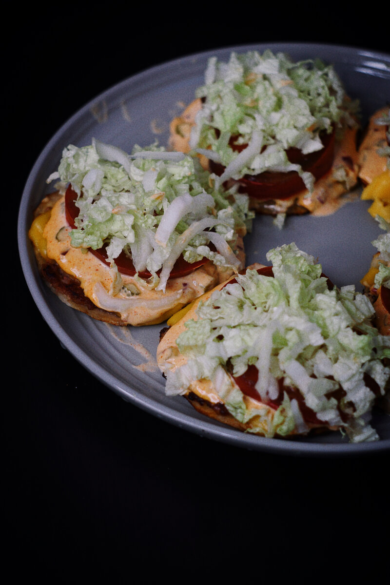 На слой с сыром распределяем соус, далее томат и сверху айсберг (либо китайскую капусту).