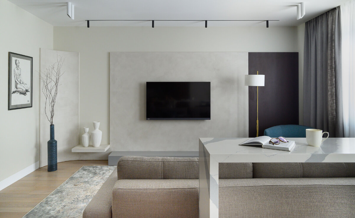 При продумывании световых решений необходимо опираться на цветовые нюансы, ведь свет и цвет всегда идут рука об руку. Несмотря на то, что интерьер должен быть максимально универсальным, в нем все равно должны присутствовать акценты, оживляющее пространство. «Поскольку при создании проекта мы опираемся на расположение дома, его архитектуру и вид за окном, мы разбавили нейтральные тона оттенками неба. Когда я впервые пришла на этот объект, меня поразило, сколько природы было видно в большие окна. Оно буквально просило пустить ее в дом», — рассказывает Дарья, — Так сложилась гармония: квартира, дом и атмосфера вокруг запели в унисон».