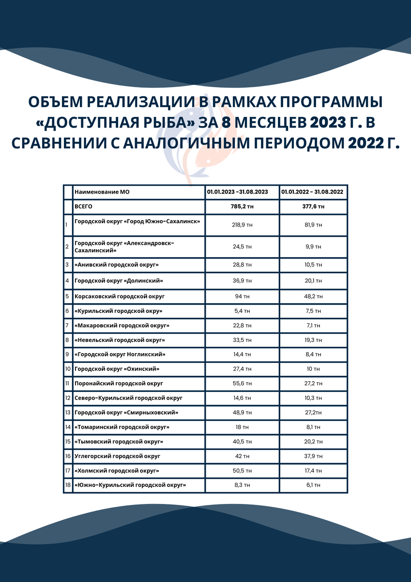 В продолжении ежемесячного дайджеста Министерство по рыболовству Сахалинской области публикует статистику работы программы «Доступная Рыба». Результаты каждого муниципалитета опубликованы за период с 01.01.2023 по 31.08.2023 с делением по видам и предприятиям, а также с указанием объемов и цен реализации. В целом за год, благодаря слаженной работе всех участников проекта, а именно Губернатора Сахалинской области, министерства по рыболовству Сахалинской области, муниципалитетов всех районов Сахалинской области, большинства предприятий региона и рыбакам, а также за счет благоприятной промысловой обстановке, удалось повысить объем реализации в более чем два раза. В 2023 общий объем реализованной рыбы в рамках проекта «Доступная рыба» на отчетный период составил 785.2 тн, за аналогичный период 2022 года 377.6 тн. Следить за обновлениями и анонсами проекта по каждому району удобно в телеграм канале https://t.me/accesseblefreshfish