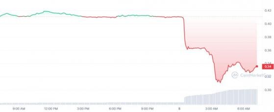 Сотрудники исследовательской компании Lookonchain сообщили, что вскоре после полуночи по Москве неизвестный кит обменял 9 млн SYN на стейблкоины USD Coin (USDC) на сумму $ 2,34 млн, продав токены по заниженному курсу $ 0,26. После совершения этой сделки цена Synapse упала на 24% до $ 0,31.