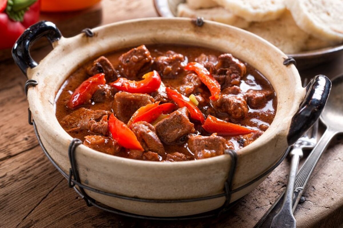 Венгерская кухня славится острыми и сытными блюдами. Одним из наиболее известных можно смело назвать гуляш. Готовят его с различными специями, острым перцем и чесноком. Рассказываю рецепт гуляша с говядиной и сладким перцем! Ингредиенты Пошаговый рецепт приготовления 1.Говядину промойте, слегка обсушите и нарежьте небольшими кусочками. 2.Болгарский перец, лук и морковь очистите, нарежьте. 3.На сковороде обжарьте говядину с маслом до золотистого цвета. Старайтесь, чтобы каждый кусочек подрумянился со всех сторон. 4.Всыпьте лук с морковью и продолжайте готовить 4-5 минут. 5.Добавьте томатную пасту, смешанную со стаканом воды, и протушите 20 минут под крышкой. 6.Переложите мясо с овощами в кастрюлю, добавьте болгарский перец, черный перец горошком и молотую паприку. 7.Влейте оставшуюся воду и продолжайте готовить на медленном огне еще полчаса. 8.Выдавите через пресс чеснок, посолите, поперчите и через 5 минут выключите.