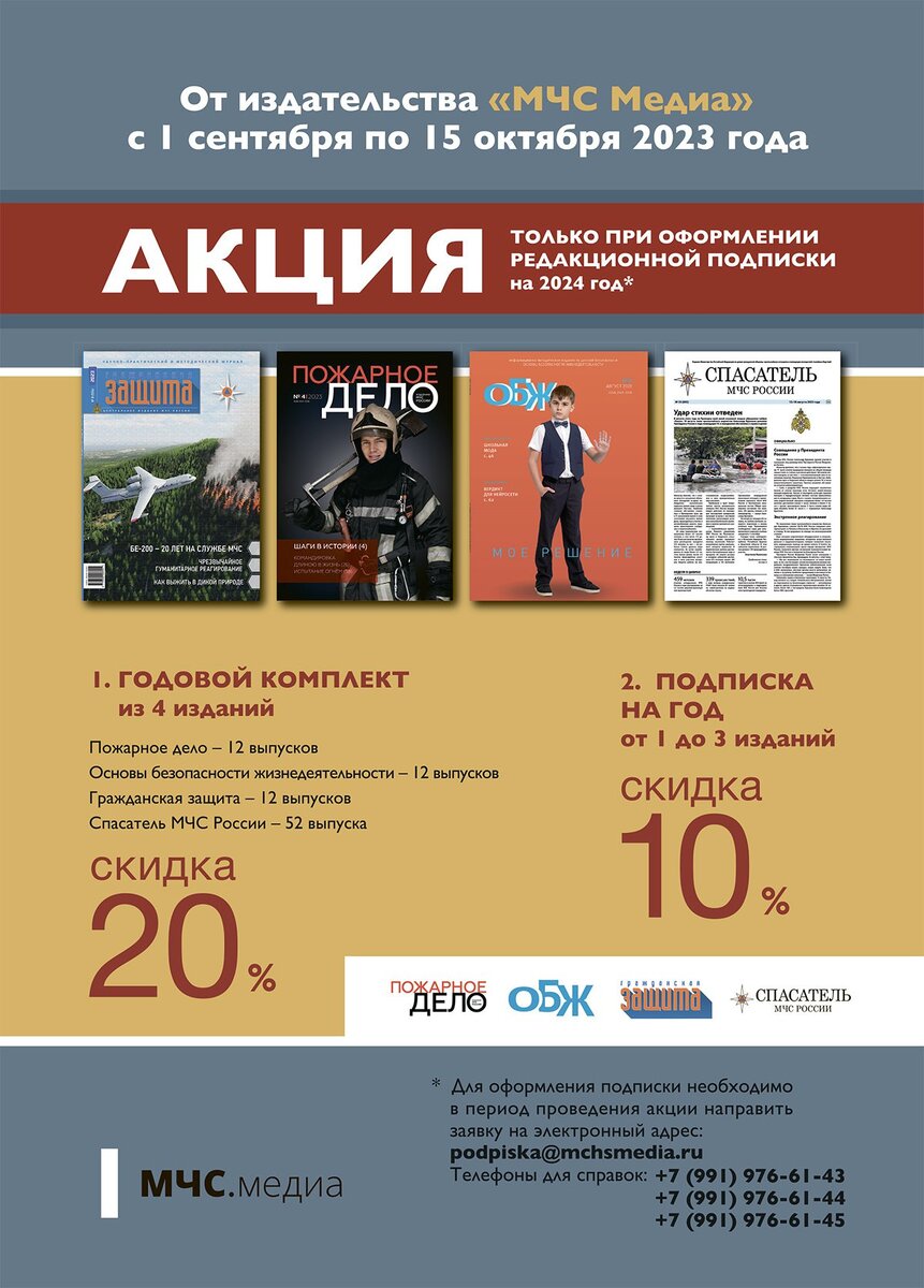 Началась подписная кампания на 2024 год на ведомственные периодические печатные издания МЧС России: газета «Спасатель МЧС России», журналы «Гражданская защита», «Пожарное дело», «Основы безопасности жизнедеятельности». ФГБУ «МЧС Медиа» в период с 01 сентября по 15 октября 2023 г. предлагает оформить подписку на 12 месяцев по акциям: 20% (подписка на все 4 издания) и 10% (подписка от 1 до 3-х изданий). «Спасатель МЧС России» Еженедельная газета МЧС России с эксклюзивными материалами о современных технологиях спасения, а также жизни пожарных и спасателей. «Гражданская защита» Ежемесячное научно-методическое и практическое издание МЧС России, повествующее о гражданской обороне и защите населения. «Пожарное дело» Ежемесячный научно-технический журнал, посвященный вопросам пожарной и комплексной безопасности, а также средствам противопожарной защиты. «Основы безопасности жизнедеятельности» Ежемесячное информационно-методическое издание для преподавателей курса ОБЖ образовательных учр