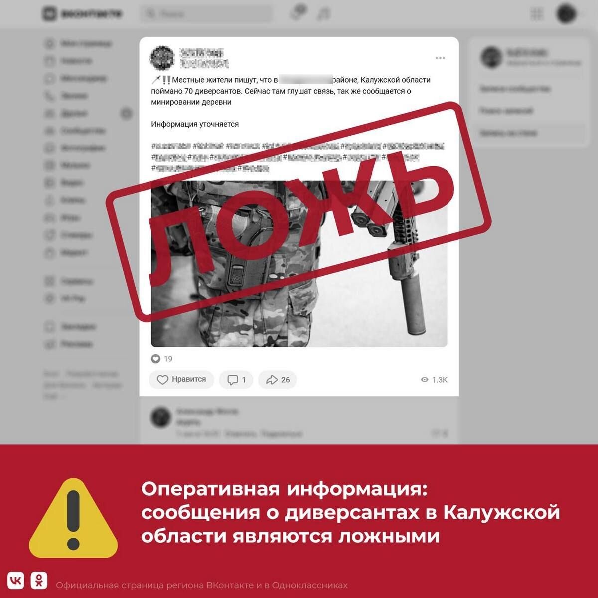 Как сообщили в пресс-службе правительства Калужской области, в соцсетях и мессенджерах среди жителей некоторых районов области распространяется информация о диверсантах, которые находятся на территории области и преступлениях, которые они совершили. По словам чиновников, это ложь. "Данная информация является полностью вымышленной и распространяется с целью распространения паники среди местных жителей. Правоохранительные органы региона постоянно проводят необходимые профилактические и специальные мероприятия для обеспечения безопасности жителей нашей области", - говорится в сообщении пресс-службы регионального правительства. Калужан попросили доверять только проверенной информации из официальных источников и самим не распространять слухи.