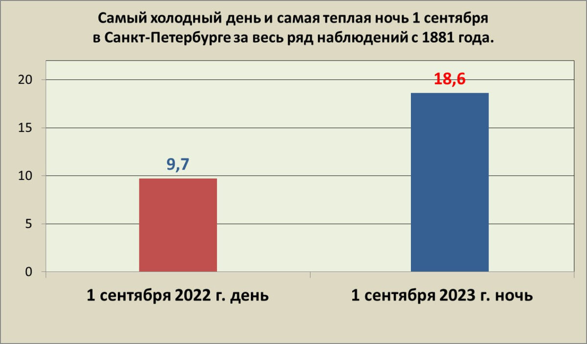 «Природа загадочна и трудно предсказуема». Колесов рассказал о пропущенном ночном рекорде В начале сентября в Петербурге зафиксирован погодный рекорд. О «важном экстремуме» сообщает 5 сентября главный синоптик города Александр Колесов. «Загруженность в последние дни, да и сложная погода несколько сбили с привычного ритма, поэтому пропустил один важный экстремум. Виноват, исправляюсь», — пишет он. Ночь 1 сентября в этом году стала самой теплой за всю историю наблюдений в городе, то есть с 1881 года. Температура не опустилась ниже 18,6 градуса — это самый высокий показатель для всех сентябрьских ночей. До этого лидировало 3 сентября 1977 года (18,1 градуса), а среди ночей 1 сентября самая тёплая ночь была в 1963 году (17,7 градуса). Любопытно, что в прошлом году 1 сентября оказалось самое холодное в истории — всего 9,7 градуса днём, а в этом году — самая тёплая ночь. «Вот так бывает, но что тут скажешь... Природа загадочна и трудно предсказуема. Мы и на ночь 1 сентября прогнозировали оче