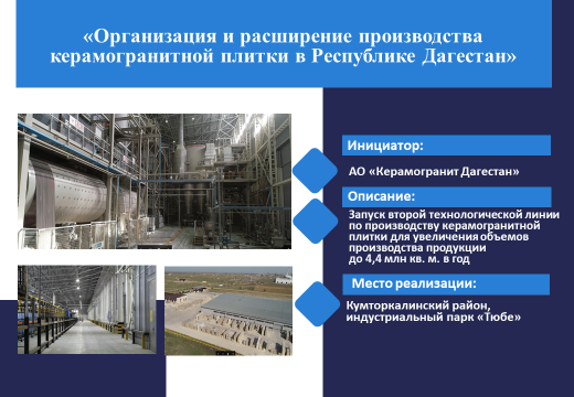 Суть проекта: проектом предусматривается запуск второй технологической линии по производству керамогранитной плитки, рост производственных мощностей в 2,5 раза, увеличение объемов производства продукции до 4,4 млн кв. м. в год. Производимый ассортимент будет включать в себя как керамогранитную плитку форматов 400х400, 200х600, 600х600, так и широкоформатную плитку 800х800, 200*800, 200х1200, 600х1200 мм, завоевывающую все большую популярность в мире и в России. Продукция (код ТН ВЭД ЕАЭС № 6907) включена в приказ Минпромторга России № 1021 от 29.03.2019 г. «Об утверждении перечня продукции для целей реализации государственной поддержки организаций, реализующих корпоративные программы повышения конкурентоспособности». Объем инвестиций – 1 731,0 млн рублей, из них: собственные средства– 531,0 млн рублей; заемные средства – 1200,0 млн рублей (займ ФРП РФ по программе «Приоритетные проекты» одобрен Наблюдательным Советом ФРП РФ