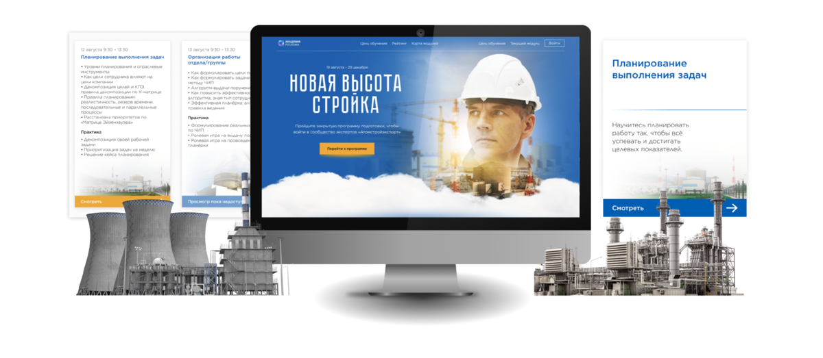 «Новая высота» — это программа обучения «Росатома» для управленцев разного уровня, которые руководят строительством атомных станций. Например, в Бангладеш, Курске и Египте. Это и организаторы строительных работ, начальники участников, главные инженеры. Год назад был пилотный запуск программы, и к нам обратились с задачей переупаковать обучение с учётом обратной связи от целевой аудитории — создать образовательную платформу, которая вовлечёт пользователей в обучение. Рассказываем, как мы справились с этой задачей. Разработали концепцию просветительского курса в формате истории С представителями ядра целевой аудитории провели глубинные интервью. Узнали, что не устраивало в прошлой версии программы «Новая высота», и выяснили детали рабочего контекста — чтобы в своей разработке опираться на реальные запросы и предпочтения. Разработали дизайн по визуальным референсам, которые импонируют ЦА На этапе исследования узнали, что ЦА нравится, когда их работу преподносят как что-то крутое — и назва