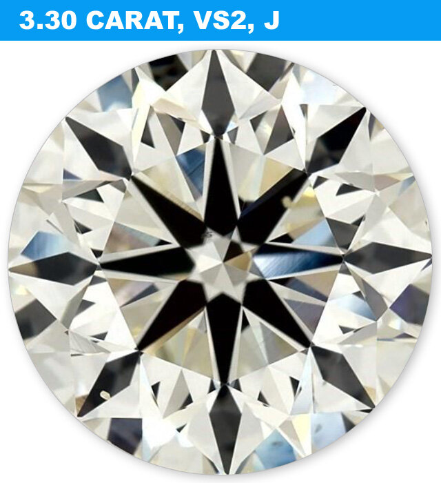 Чем больше вес бриллианта в каратах, тем больше цвета (обычно жёлтого) вы можете увидеть в бриллианте. Оттенок становится более очевидным потому, что вы можете видеть большую часть массы алмаза. Вы можете посмотреть на бриллиант весом 0,25 карат цвета J, и он может выглядеть белым. Но при просмотре бриллианта весом более 1,00 карата цвета J на самом деле он может выглядеть бледно-желтым: Более крупные бриллианты имеют более насыщенный цвет. Если вы посмотрите на бриллиант весом 3,30 карата цвета J, вы действительно уви
