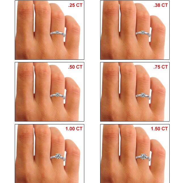 1,00 карата - это 100 пунктов. Вес как деньги! Таким образом, полкарата - это как 50 копеек. Четверть карата - как 25 копеек. 0,1 карата - как 10 копеек. 0,05 карата - это как пять копеек. 0,01 карата - как одна копейка. И так далее! Думаю, суть вы ухватили! Но самое главное - это знать не только вес в каратах, но и то, как он выглядит на пальце! Давайте посмотрим, как выглядят на руке бриллианты различного веса. Вес 0,38 карата появился на картинке не случайно: это средний вес бриллианта, который приобретает среднестатистический амер