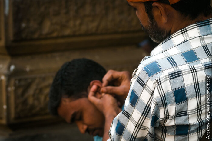 В Индии много забавных профессий и услуг, которые с этим связаны. Эта же профессия в Индии очень древняя и на мое удивление имеет большой спрос среди клиентов. Эта услуга чистильщика ушей, предоставление которой вы можете наблюдать в этой стране. Клиента прямо на улице на что-то усаживают, а чистильщик ушей достает свой инструмент, который насчитывает несколько видов металлических палочек разных конструкций, и начинает с умным видом тыкать их в уши. Честно скажу, зрелище не для слабонервных. Мне, привыкшему чистить уши ватными палочками из пластика или дерева, это показалось жутким. Одно не верное движение и вы можете лишиться слуха навсегда, а в ответ можете услышать (уже только вторым ухом)Сорри, сэр". О том, что эти инструменты никогда не дезинфицируются, думаю, даже говорить не стоит. С чисткой ушей связан и еще очень популярный развод туристов в Индии. Ситуации могут начинаться по-разному. К вам могут подойти и с испуганным видом показать на уши (типа, вроде с ними что-то не так),