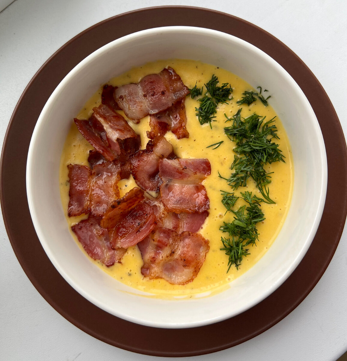 Вам понадобится: 🔪картофель - 3 шт 🔪морковь - 1 шт 🔪лук репчатый - 2 шт 🔪сливочный сыр - 200 гр 🔪бекон сырокопченый - 1 упаковка 🔪оливковое и сливочное масла 🔪соль, перец, итальянские травы - по вкусу Поехали 🚀 Картофель, морковь и лук нарезать крупными кубиками. Разогреть 4 столовых ложки оливкового масла в кастрюле. Выложить в нее овощи, обжарить 2-5 минут. Залить горячей водой так, чтобы овощи были покрыты и варить до полного размягчения (30-40 минут). Пока варятся овощи, займёмся беконом. Режем бекон средними кусочками (5-7 см). Обжариваем на сухой сковороде каждый кусочек отдельно до румяной корочки. Кстати, удобнее всего переворачивать тонкие слайсы китайскими палочками 🥢 Когда бекон готов, выкладываем его на салфетку, чтобы убрать лишний жир. Хрустящая закуска готова!🤤 Проверяем овощи, они должны быть мягкими, полностью разваренными. Пюрируем содержимое кастрюли с помощью погружного блендера (или сита). Добавляем к супу 2 столовых ложки сливочного масла и сливочный