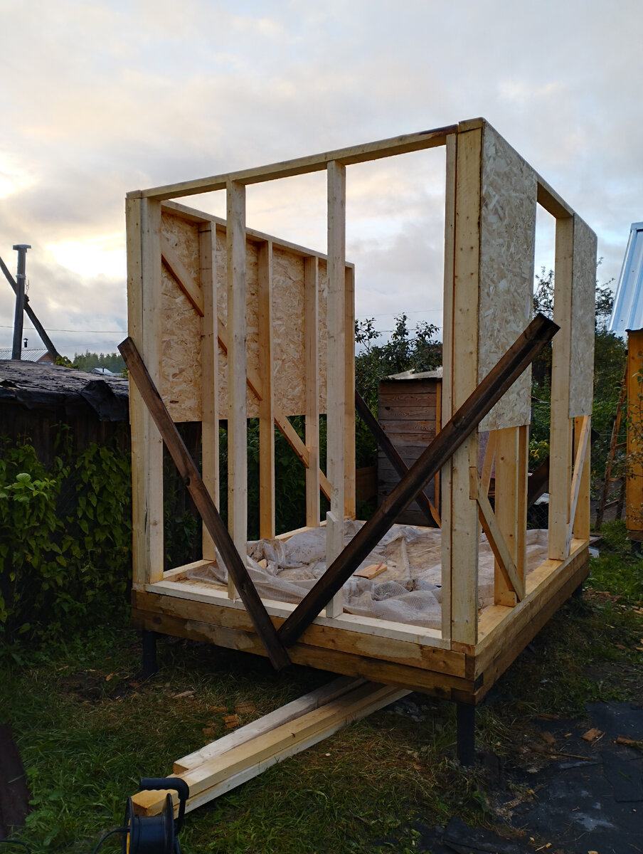 Две стены стоят, и даже не падают😅, приступаю к оставшимся двум. Тут всё шло как по маслу, эти стены меньше по размеру, соответственно легче. Собрала я их также лёжа на полу по одной, сделала запилы под укосины, подняла. Укосины ставила уже на стоящую вертикально стену. Небольшие косяки по геометрии строения всё же есть, но не критичные, да и я не строитель👷♀️. Думаю, что отхождение на пару сантиметров от идеала простительны новичку😇 Когда все четыре стены стоят на своих местах, можно начать обшивку ОСП. И конечно же ОСП придаст прочности каркасу, ведь я всё ещё боюсь что он рухнет от дуновения ветра. Чтобы было проще прикручивать большие листы, ведь одной держать целый лист ОСП на весу стоя на стремянке и одновременно работать шуруповёртом невозможно, использую такой лайфхак: в стойки закручиваю по саморезу с одной и другой стороны, но не до конца, затем поднимаю лист и ставлю на эти саморезы как на подпорки вот так: Это намного облегчает работу, когда у тебя нет помощника. Ког