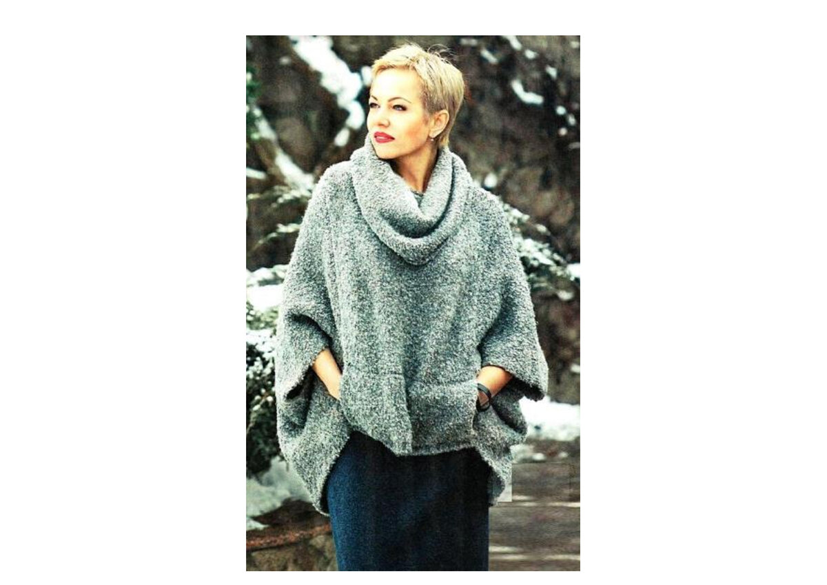 Пончо, накидка или пуловер? Трудно сказать но смотрится очень красиво! Кстати, снуд можно связать отдельно. Вяжется очень просто и легко свяжет даже новичок. Размер: М-ХL Вам потребуется: буклированная пряжа (40% акрил, 35% шерсть мериноса, 25% альпака, 375 м/100 г) - 650 г серого цвета, спицы №3, крючок №5. Лицевая гладь: лицевые ряды - лицевые петли, изнаночные ряды - изнаночные петли. Резинка 1х1: вяжите попеременно 1 лиц. п. 1 изн. п. Перед: наберите 180 п. и вяжите лицевой гладью 47 см ровно. Затем для выреза горловины закройте средние 50 п. и далее каждую сторону вяжите отдельно. Для закругления выреза закройте с внутренней стороны в каждом 2-м ряду 5п., 3 п., 2п., 1 п. Через 55 см от начала вязания закройте оставшиеся петли плеча. Вторую сторону свяжите симметрично. Спинка: вяжите аналогично передней части, но выреза горловины закройте средние 50 п. на высоте 52 см от начала вязания и далее каждую сторону вяжите отдельно. Для закругления выреза закройте с внутренней стороны в