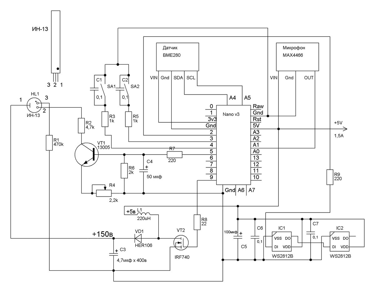 В Интернете довольно много схем термометров на лампе ИН-13. Предлагаю свой вариант термометра, а точнее - термобарометра на этой лампе с открытым скетчем и простой схемой управления. Схема построена всего на двух транзисторах, один из которых (VT1) управляет лампой, а на втором (VT2) построена схема генерации высокого напряжения (+150в). На двух адресных светодиодах собрана подсветка шкалы термобарометра. Левая шкала - для температуры, правая - для атмосферного давления. Устройство поочередно, в течении 30 секунд, показывает текущую температуру, при этом загорается только левый светодиод, подсвечивая левую шкалу, причем цвет свечения зависит от температуры, чем холоднее - тем цвет становится холоднее и наоборот (от синего до ярко желтого-красного) и текущее давление, при этом загорается только правый светодиод, подсвечивая правую шкалу, цвет свечения аналогично зависит от текущего давления. Кнопкой SA2 можно подкорректировать значение температуры или давления в пределах -10...+10, корр