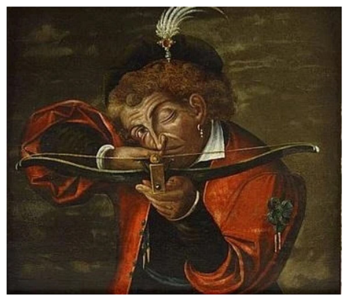 Кстати, название работы переводится по-разному - Арбалетчик и молочница или Стрелок и доярка. Почему именно такое сочетание, и в кого (и зачем) целится стрелок - не понятно.
