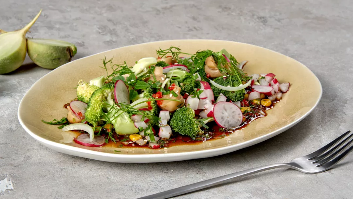 Салат из брокколи частенько входит в список самых востребованных и часто используемых рецептов среди приверженцев полезного питания. К тому же он и выглядит очень симпатично, особенно если брать продукты разных цветов. Салат с брокколи, редисом и маринованными шампиньонами получается не только полезным, но и оригинальным на вкус. Заправлять такую закуску можно любым растительным маслом, желательно оливковым.