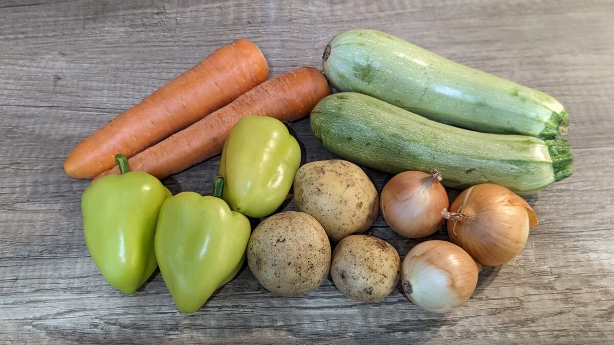 Кабачки и чеснок почистить, у перцев отрезать верхушки и вынуть серединку, всё промыть и обсушить. Колечки верхушек перцев, удалив плодоножку, я режу в салат.