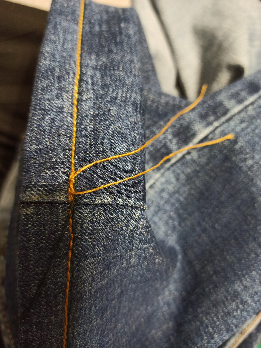 Аккуратная машинная строчка - залог аккуратного готового изделия. Изнанка должна быть не только красивой, но и надёжной. Поэтому я всегда прячу нитки этим способом. Укорачивала джинсы, по низу штанин проложила отделочную строчку на расстоянии 1,5 см. от сгиба. Закрепки со стороны шагового шва. И после этого - спрятать концы ниток. Покажу на примере на фото. Вот так обычно выглядят нитки после завершения шитья. У меня #20, толще обычных. Но схему это не меняет. Продеваем иголку внутрь шва (под подгибку) и вставляем в неё конец одной нитки. Выводим иголку с изнаночной стороны, чтобы с лицевой не оставлять проколов. Вытягиваем нитку полностью, обрезаем максимально близко к ткани (можно даже немного натянуть) и заправляем конец в шов. Повторяем то же самое со второй ниткой. В итоге и с изнаночной стороны получается аккуратно, и с лицевой - при этом строчка надёжно закреплена и не разойдётся при носке. Вот так выглядит готовое изделие. Пользуетесь этим методом?