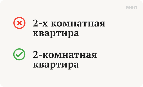 Цифровая запись — это не IT-термин, а способ написания числительного — не словами, а собственно цифрами. А еще есть словесно-цифровая форма написания слов — разберемся с ее грамматическими нюансами. Правильно: 2-комнатная квартира Вообще, конечно, проще всего написать «двухкомнатная» — грамматические справочники предлагают именно этот вариант как предпочтительный. Но слово это довольно длинное, и его не всегда удобно использовать. В риелторских объявлениях, например, есть лимит на количество знаков в заголовке, и, если использовать большую его часть на слово «двухкомнатная», для остальной информации останется меньше места. «2-комнатная» в этом случае — вполне элегантный компромисс. Правило тут работает такое: числительные, входящие в состав сложных существительных или прилагательных в словесно-цифровой форме, пишутся цифрой и присоединяемым к ней дефисом существительным либо прилагательным. Важно: при использовании словесно-цифровой формы записи буквенные наращения (то самое пресловуто