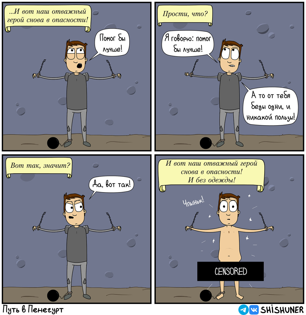 Эй, вы же помните Сэра Шишунера? Конечно же помните! Ну, а если нет, специально для вас теперь существует отдельная подборка, где можно в полной мере, не покидая Дзена насладиться его приключениями! Новая арка начинается совсем не радужно: Сэр Шишунер попадает в плен к неизвестному врагу, да к тому же ссорится с рассказчиком, который, впрочем, не сильно-то стремиться помогать благородному рыцарю. 1. 2. 3. Здесь сделаем небольшую текстовую паузу. Дело в том, что события следующего комикса происходят спустя небольшой промежуток времени и если читать его без паузы, может показаться, будто бы автор что-то упустил. Вовсе нет! Каждый из комиксов, которые здесь представлены, выходили в группе ВК с промежутком, который позволял понять, что в мире ПвП уже прошло какое-то время! Продолжаем! 4. 5. 6. Удивительно, но некоторые прочитавшие оказались в недоумении: почему алкоголь сперва пленил рыцаря, а потом отпустил? Всё просто: рыцаря недооценили, а увидев мощь, с которой невозможно совладать, р