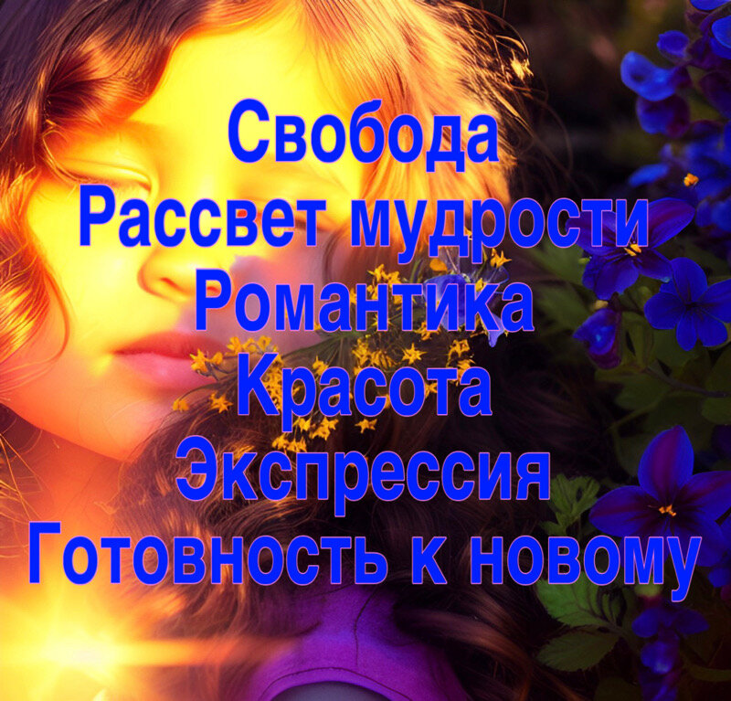 Метафорическая картина, которую вы себе нарисовали, представляет собой визуальный образ, который можно интерпретировать приблизительно так : Девушка, идущая по саду из синих цветов, символизирует свободу и возможность новых начинаний. Светлое лицо, освещенное ярким солнцем, олицетворяет новый день, рассвет, идеи и энергию, которые они приносят за собой. Зеленые растения вокруг - то, что вдохновляет ее, мотивирует, дает жизненную силу и кислород, вдыхая который она способна действовать по велению внутренних сил. Ярко фиолетовое платье девушки и открытая спина отражают ее индивидуальность, стиль и желание выразить себя. Платье является смелым выбором, символизирующим о ее уверенности и собственной уникальности. Собранные в пучок волосы подчеркивают ее элегантность и аккуратность, указывая на педантичность в делах, как черту характера, приносящую пользу. Карта также передает атмосферу романтического момента в природе. Синие цветы и зеленые растения символизируют красоту и гармонию природ