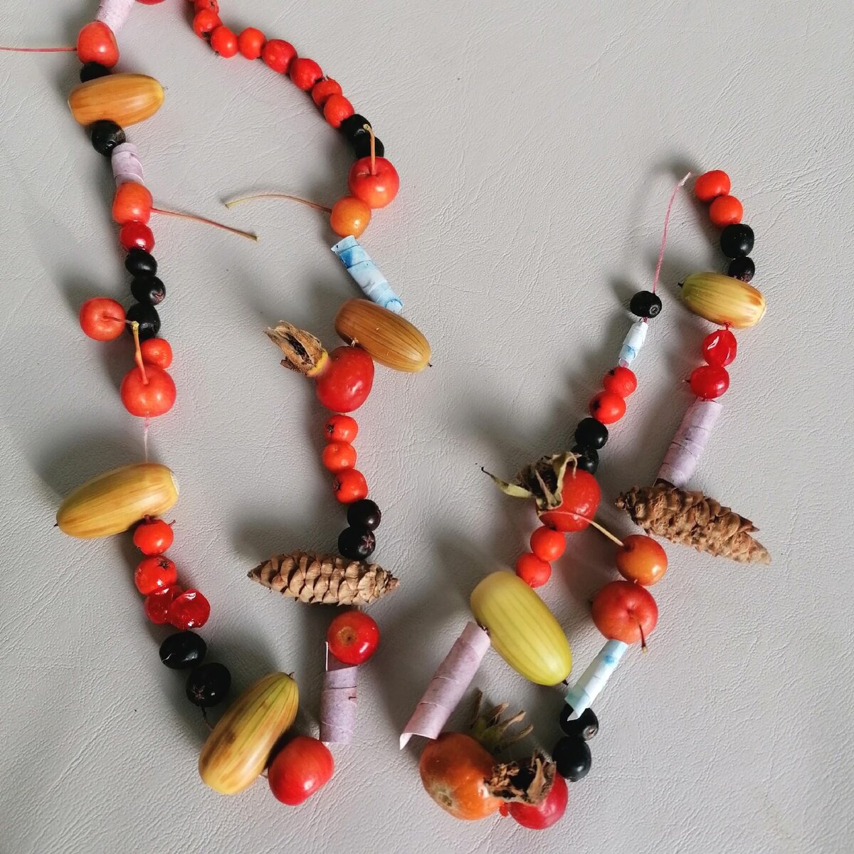 Сейчас на прогулках можно найти столько разных сокровищ, которые буквально сами просятся в руки — и желуди, и шишки, и шиповник, и нарядная рябина, и яблочки-ранетки. С пустыми руками домой вернуться просто невозможно. Мы и не оказываем себе в такой радости. Делаем потом бусы. Ребёнку очень нравится нанизывать их на иголку, составлять композиции. Конечно, бусы примеряются и на себя и на всех кукол, иногда дарятся подружкам. Некоторые развешиваем для украшения дома — с ними сразу становится ярко, появляется осенний уют.