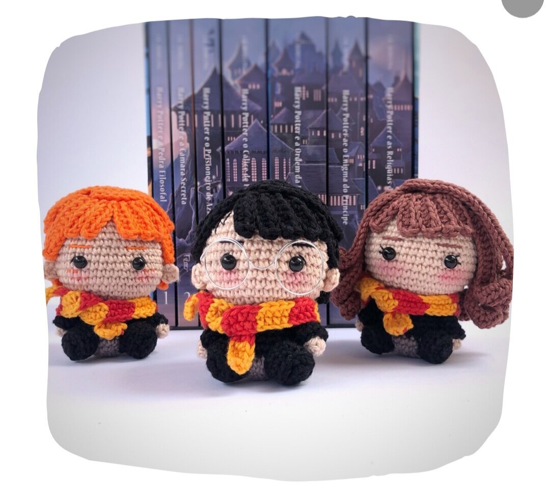 Продолжаем вязать героев Поттерианы. Первым был Гарри: Еще Гермиона: Полумна: Перевод: Вязальные приключения Условные обозначения: КА - кольцо амигуруми ВП - воздушная петля СБН - столбик без накида ПССН - полустолбик с накидом ССН - столбик с накидом СС- соединительный столбик УБ - убавка ПР - прибавка Материалы: Тело Начинайте вязать темно-серой нитью. 1 ряд: 6 СБН в КА [6] 2 ряд :6 ПР [12] 3 ряд: (1 сбн, 1 пр) х 6 [18] 4 ряд: 1 сбн, 1 пр, (2 сбн, 1 пр) х 5, 1 сбн [24] 5 ряд: 24 СБН [1 ряд] Изменить цвет на черный 6-9 ряды: 24 сбн [4 ряда] 10 ряд: 1 сбн, 1 уб, (2 сбн, 1 уб) х 5, 1 сбн [18] 11: 18 сбн [1 ряд] Голова Сменить нить на бежевую 12 ряд: 1 сбн, 1 пр, (2 сбн, 1 пр) х 5, 1 сбн [24] 13 ряд: (3 сбн, 1 пр) х 6 [30] 14 ряд: 2 сбн, 1 пр, (4 сбн, 1 пр) х 5, 2 сбн [36] 15 ряд: (5 сбн, 1 пр) х 6 [42] 16-23 ряды: 42 сбн [8 рядов] 24 ряд: (5 сбн, 1 уб) х 6 [36] 25 ряд: 36 сбн [1 ряд] 26 ряд: 2 сбн, 1 уб (4 сбн, 1 уб) х5, 2 сбн [30] 27 ряд: (3 сбн, 1 уб) х 6 [24] •Вставить глаза в 8-м