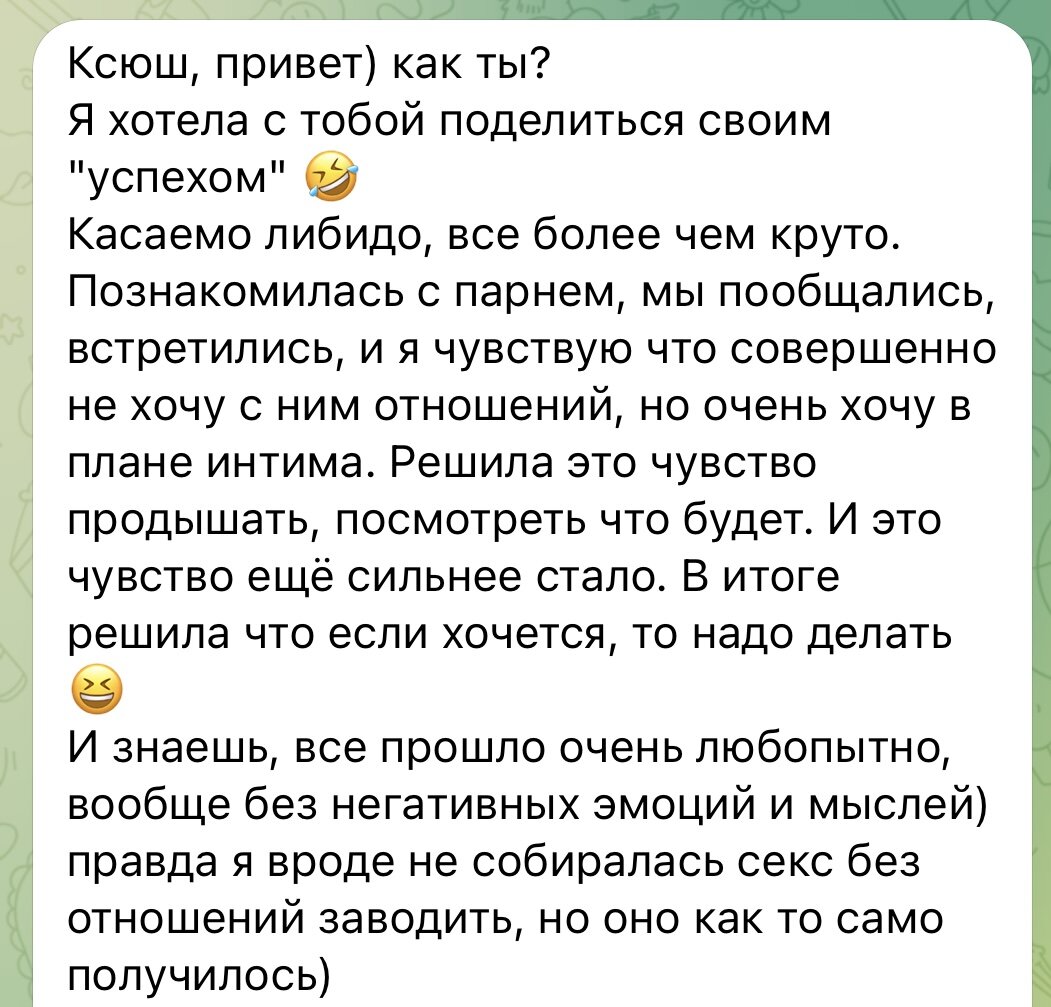 — Либидо в минусе каком-то… Говорит мне девушка (ей нет ещё и 30) с умопомрачительной фигурой, красивым лицом и потрясающим чувством юмора. — Так. А чего хочешь? — Хочу чувствовать себя женственной, желанной, красивой! Страсти хочется… — А сейчас? — Замкнутость в плане общения с другими людьми. Нет близких отношений. Мысль о физической близости вызывает слёзы… В процессе работы выявили негативные убеждения из неприятного опыта общения с мужчиной. «Со мной что-то не так» «Я какая-то не такая» «Я не дотягиваю до его уровня» «Я хуже, чем он» «Я его не достойна» «Я не могу быть собой» «Я умерла как девушка» Отработали все убеждения. Работа заняла 4 встречи по 90 минут 1 раз в неделю. На фото - результат клиентки спустя 2 месяца после работы. Если чувствуешь, что твои убеждения мешают тебе жить полной жизнью, записывайся на диагностическую онлайн-встречу. За 20 минут сможешь выявить свои негативные убеждения и поймёшь, что с этим можно сделать. В неделю есть 2 бесплатных места.