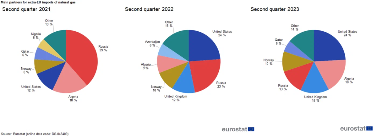 Евростат опубликовал статистику изменения структуры внешней торговли по ключевым товарным группам со 2 квартала 2021 по 2 квартал 2023 года. За этот период доля российского газа в европейском импорте сократилась с 38,5% до 12,9%. Несмотря на то, что заместить экспорт газа было гораздо сложнее, чем экспорт нефти, ввиду отсутствия нужной инфраструктуры, все равно ЕС сделал это намного оперативнее, чем многие ожидали. Что в результате привело к снижению цены на газ в Европе до уровней 2010-2020 годов: уже на эту зиму газовые хранилища заполнены по таким привычным для региона, "некризисным" ценам. Итак, вот данные структуры газового импорта ЕС за вторые кварталы 2021, 2022 и 2023 года. В 2021 году Россия занимала почти 40% европейского рынка газа. В 2022 году, уже во 2 квартале ее доля снизилась до 23%. Это результат принуждения к переходу на оплату по новой схеме "в рублях": тогда многие европейские страны сразу же полностью отказались от закупок, при том, что никакие санкции против росси