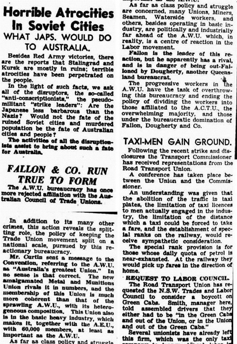 Tribune (Sydney, NSW : 1939 - 1991), Wednesday 17 February 1943, page 4 Ужасные зверства в советских городах ЧТО ЯПОШКИ СДЕЛАЮТ С АВСТРАЛИЕЙ. Помимо побед Красной Армии, имеются также сообщения о том, что Сталинград и Курск практически находятся в руинах; ужасные зверства совершались в отношении людей. В свете этих фактов мы просим всех несогласных, так называемых "антипризывников", псевдо-воинственных "ударных лидеров": разве японцы меньшие варвары, чем нацисты? Не будет ли судьба разрушенных советских городов и убитого населения судьбой австралийских городов и народа? Деятельность всех деструктивных сил способствует тому, чтобы такая судьба постигла Австралию. Don Dorrigo Gazette and Guy Fawkes Advocate (NSW : 1910 - 1954), Friday 19 February 1943, page 1 УЖАСЫ ОККУПАЦИИ ГОРОДА КУРСКА Советская газета Правда утверждает, что тысячи курских граждан были замучены до смерти в течение первых шести месяцев немецкой оккупации. Еще более 25000 человек были насильственно высланы в Германию.