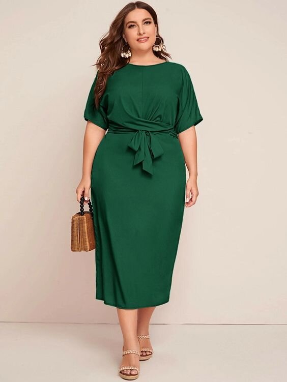 - Эффектное зелёное платье, которое хорошо будет смотреться на пышной фигуре типа «песочные часы». Модель сшита по фигуре, хотя и не облегает. У линии талии – драпировка и пояс, который завязывается пышным бантом. Благодаря красивой ткани насыщенного зелёного цвета, модель выглядит нарядной, даже если не использовать дополнительные аксессуары. Достаточно только надеть красивую обувь.