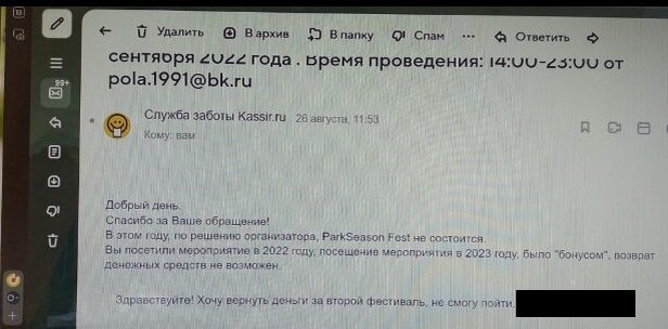 - Я по поводу фестиваля ParkSeason Fest, который передумали в этом году проводить. Ведь обещали, что будет вторая часть. Есть информация? В возврате денег отказали. В прошлом году была первая часть, которую переносили часто. Подруге, с которой собирались идти, ответили, что в прошлом году она была на первой части, поэтому денег ей уже не вернут.