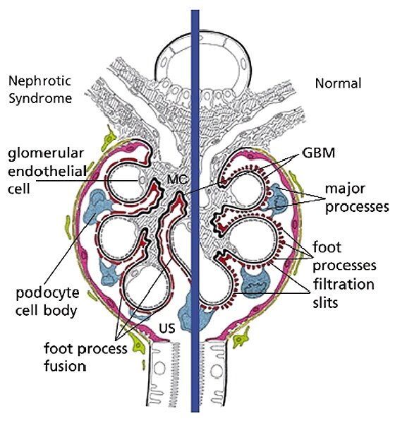 В основе патогенеза лежит повреждение преимущественно клеток подоцитов иммунными комплексами, компонентами комплемента и др. Сейчас не буду особо углубляться в типы и патофизиологию, но вкратце рассмотрим механизмы. Барьер клубочковой фильтрации состоит из фенестрированного капиллярного эндотелия, базальной мембраны и вставочных отростков подоцитов. В норме отрицательно заряженные ножки подоцитов отталкивают отрицательно заряженные ионы белков. В условиях поврежденного барьера первыми покидают сосудистое русло белки с низкой молекулярной массой, такие как альбумин (40-60 кДа), далее средне- и высокомолекулярные белки липопротеиды, глобулины (до 100 кДа).