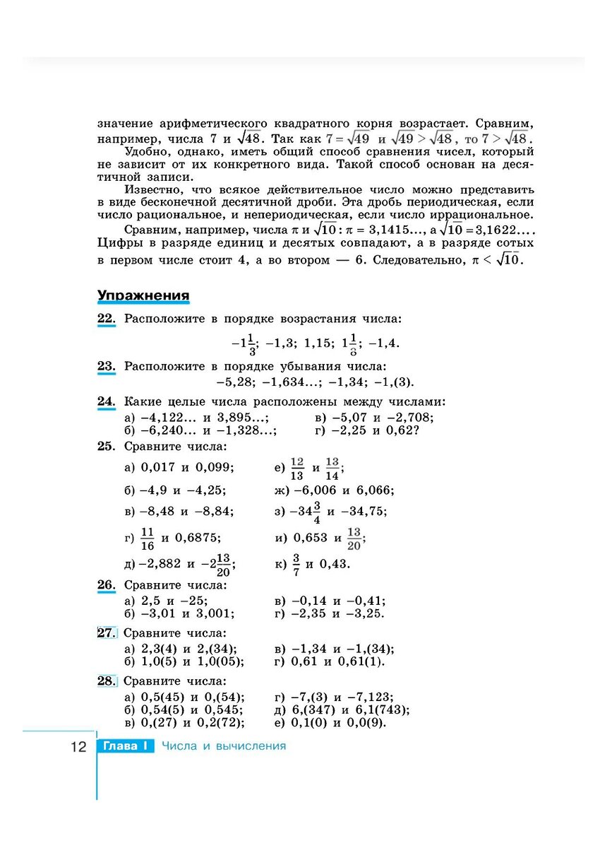 22) Нужно расположить числа от меньшего к большему. Самое первое число будет самым большим числом со знаком минус -1,4, а самым последним самое большое положительное число 1,15. Самая большая сложность в задании определить какое число больше минус 1 и 1/3 или минус 1,3? 1 и 1/3 равно 1,3333333... Минус 1,3 число больше чем число 1,33333, т.к. оно отрицательное и считаем наоборот, чем число больше, если стоит знак минус, значит оно самое маленькое -1,4; -1,33333; -1,3; 1,125; 1,15 23) Здесь наоборот - порядок убывания - самое большое число пишем первым, а потом все меньше и меньше Здесь самое большое -1,(3), т.е. -1,3333333...3 А самое маленькое -5,28 24) а) Между заданных чисел можно расставить только следующие целые числа: -4; -3; -2; -1; 0; 1; 2; 3., остальные целые числа не попадают в заданный диапазон. б) -6; -5; -4; -3; -2. в) -5; -4; -3. г) -2; -1; 0. 26) Сравнить числа а,б) слишком простое задание, без подвоха, любое положительное число больше любого отрицательного в,г) на внима