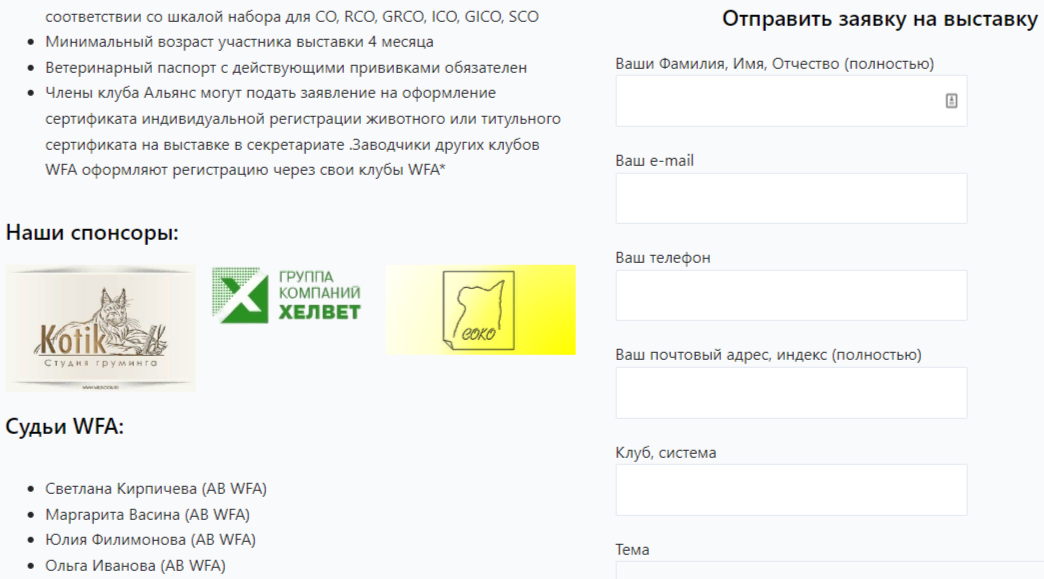 Регистрация происходит на сайте организатора выставки посредством заполнения формы заявки на участие. Информация по кошке берется из родословной. В заявке указываете фио владельца, кличка, номер родословной, порода, окрас, пол и так далее. Если питомец без породы, поля все равно нужно заполнить, поставив, например, прочерк. У новичков может возникнуть сложность при заполнении граф титул/оценка. Если на этом этапе возникла трудность, обращаемся за помощью к организаторам выставки – звоним или пишем, как удобно. У всех когда-то была первая выставка и на заполнении заявки первый раз «спотыкались» все. После регистрации и оплаты участия ждем подтверждения регистрации по электронной почте. Не нужно забывать про ветеринарную сторону участия. Проверяем ветеринарный паспорт на наличие всех необходимых прививок. Это комплексная прививка и прививка от бешенства. На дату выставки прививки должны быть действующие и их срок должен быть не менее 1 месяца до окончания действия в паспорте. Нельзя сд