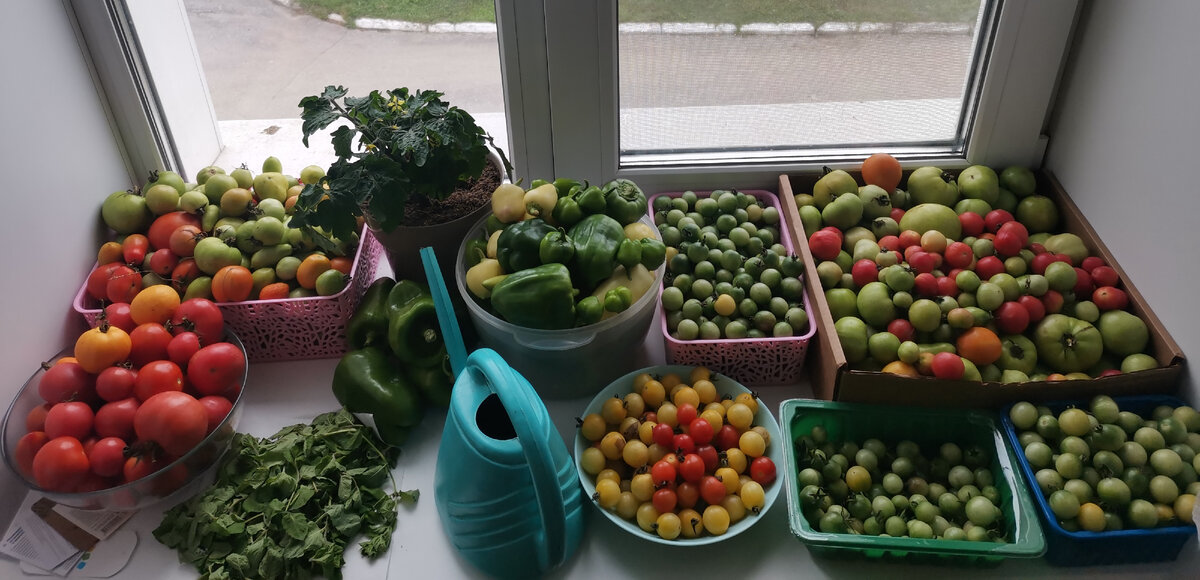 Вчера была на огороде, опять собирала урожай и приносила домой, а значит это тоже можно считать поступлением продуктов и надо учитывать. Значит смотрим, что принесла. Для картинки - вот так сейчас выглядит подоконник на кухне. Перец сладкий. Много. Полный пакет маечка. Общий вес получился 4350 грамм, но часть я подарю маме и брату, мне одной столько всё равно не съесть. Несколько огурцов. Каждый раз говорю что последние, а потом нахожу ещё. Сейчас уже цена на свежие огурцы снова поднимается, так что это выгодная "находка" в огороде. Патиссоны, штук 8 маленьких. Кабачки два малюсеньких и один средний. Одна редька дайкон. Остатки томата черри на дозаривание. Большой пучок петрушки, немного мяты, немного укропа, пара кустов салата листового. Завтрак как обычно кто во что горазд - муж опаздывал и ничего не ел, Лера съела кусочек хлеба с маслом и выпила чай, я кофе и бутерброд с маслом и сыром. Сыр, кстати, вкусный который был в закупке из Ленты 30 августа, Сыробогатов Сливочный.