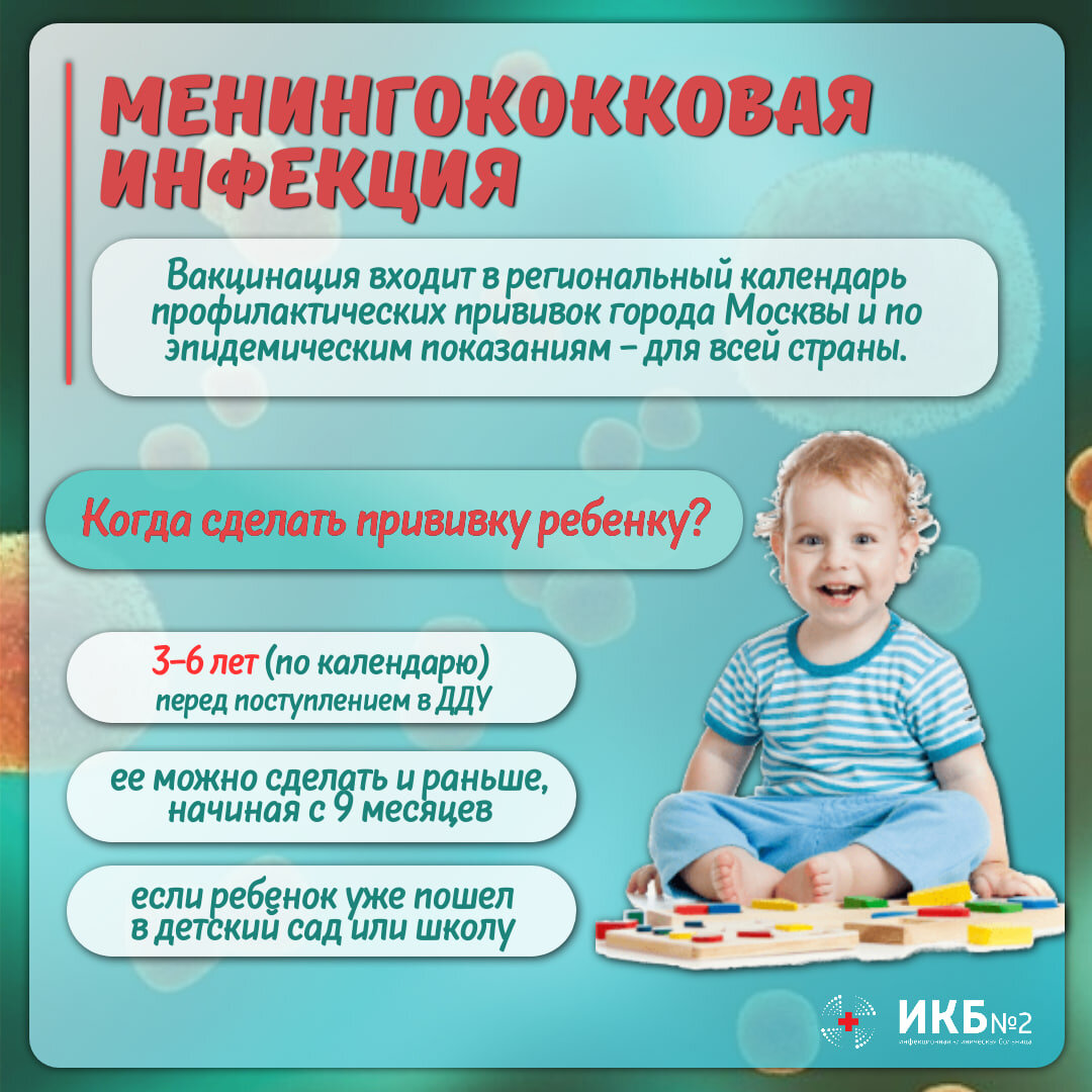 Накануне начала учебного года мы провели опрос, который показал, что нашим подписчикам интересна тема вакцинации детей от менингококковой инфекции. За информацией мы обратились к врачу-инфекционисту ИКБ №2 Ирине Партилхаевой. Вот что она рассказала: «Нужно ли говорить о том, насколько опасной является менингококковая инфекция? В 50% случаев она приводит к смертельному исходу! Бывают случаи, когда даже при лечении, назначенном вовремя, могут быть осложнения: потеря слуха, зрения, появление параличей, эпилепсии, гидроцефалии. Хорошая новость в том, что от этой молниеносной болезни можно привиться, обезопасив себя. Вакцинация от менингококковой инфекции входит в региональный календарь профилактических прививок города Москвы и по эпидемиологическим показаниям - для всей страны. Бесплатная вакцинация детей проводится в столичных поликлиниках перед поступлением в детский сад или школу - с 3 до 6 лет. Именно в этот момент они находятся в группе риска! Однако обезопасить своего ребенка можно,