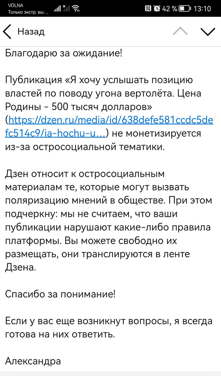 Вы такое себе представить можете? Оказывается, кому-то в нашей стране может быть плохо от того, что мы Максима Кузьменкова называем предателем, а угон вертолёта уроном для нашей страны! Написала статью Догадайтесь, кто считает тему предательства поляризацией общества.... Модератор Александра! Дайте туш и фанфары! Этот модератор не изменяет себе. Она точно так же находила остросоциальную тематику и в текстах, касающихся победных действий наших ребят на Украине. Потом я писала в прокуратуру, потом оказывалось, что темы там никакой нет... Опять писать? Может проще закон принять против оправдания предательства такими, как Александра? Да со сроком лет на 20. Мне кто-нибудь может объяснить, каким образом предательство человека может в нашем нормальном обществе вызвать поляризацию? Кто-нибудь понимает? Я - нет! И, вообще, когда будут службы работать и вот по таким моментам привлекать к ответственности технических работников СМИ. Ведь Дзен уже СМИ или как? Все это пишу для того, что