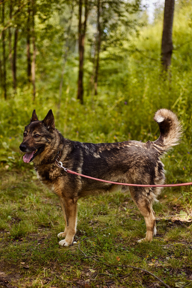 Этот пес у нас совсем недавно, прибыл летом. Возраст 4 года, среднего роста, упитанный, обычный серый дворянин – хвост колечком. Нам известно, что у него умер хозяин, но ни имени, ни места бывшего проживания собаки мы не знаем. Наверное, жил в доме, был любим и ухожен. И в одночасье стал не нужен никому. Нет, почему же, нам нужен! Он теперь наш. Собака полностью ориентирована на человека, видно, что жил с людьми, умен, контактен, доверчив и дисциплинирован. Гулять со Стюартом одно удовольствие. Он с интересом изучает новые для него места, на поводке идет отлично и ценит каждую минуточку своей прогулки на природе. Чутко слушает звуки леса, принюхивается и оглядывается. На прогулке он не расслаблен, напротив, контролирует обстановку и готов защитить своего спутника от каких-либо неприятностей. Он отличный охранник, это видно сразу. На других кобелей смотрит недобро и, кажется, не терпит никакого соперничества. Делит вольер с двумя девушками, с ними вполне добродушен и галантен даже. Пока